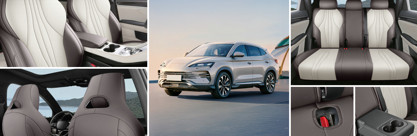 Колірна гама "Dark Brown + Beige" створює атмосферу затишку та високого статусу всередині вашого BYD Song Plus. Контрастні вставки та якісна прошивка підкреслюють сучасні лінії інтер'єру, роблячи салон візуально дорожчим та охайнішим. Чохли виглядають як заводська перетяжка шкірою, гармонійно поєднуючись із пластиковими елементами панелі. Таке дизайнерське рішення дозволяє освіжити вигляд авто та зробити кожну поїздку приємнішою для водія та пасажирів.
